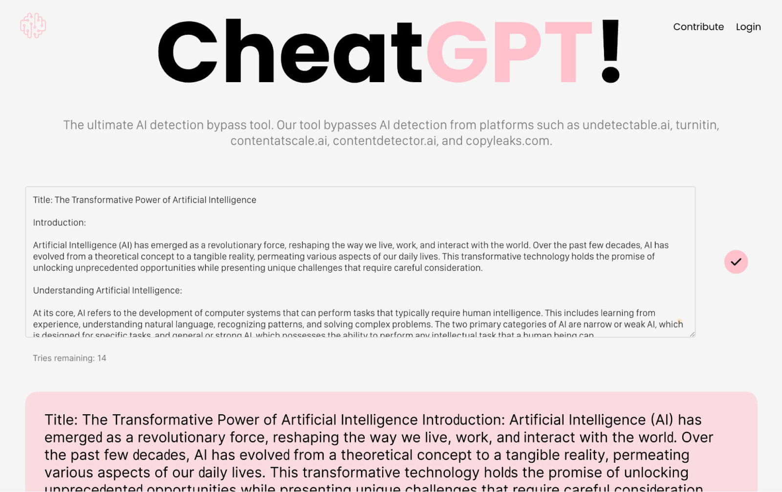This tool, an alternative to CheatGPT, can make any text go unnoticed, even those created by Bard and other AI systems. You just need to provide the text you want to hide from detection, and the tool will transform it so it slips past top AI detectors like Winston AI, Scribbr, and Turnitin.