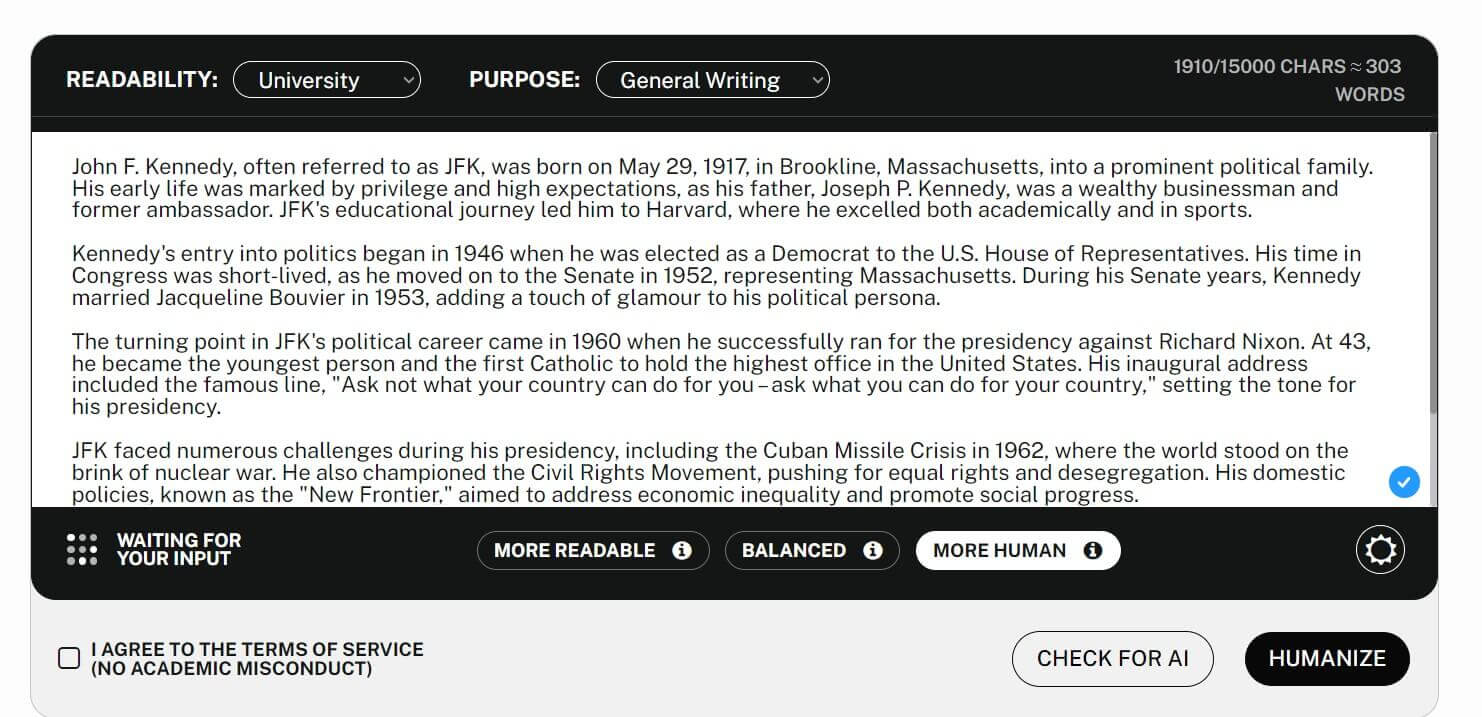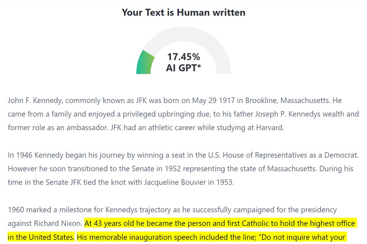We decided to test this ourselves. First, we got a 300-word piece on JFK from ChatGPT. Then, we ran it through Undetectable AI.