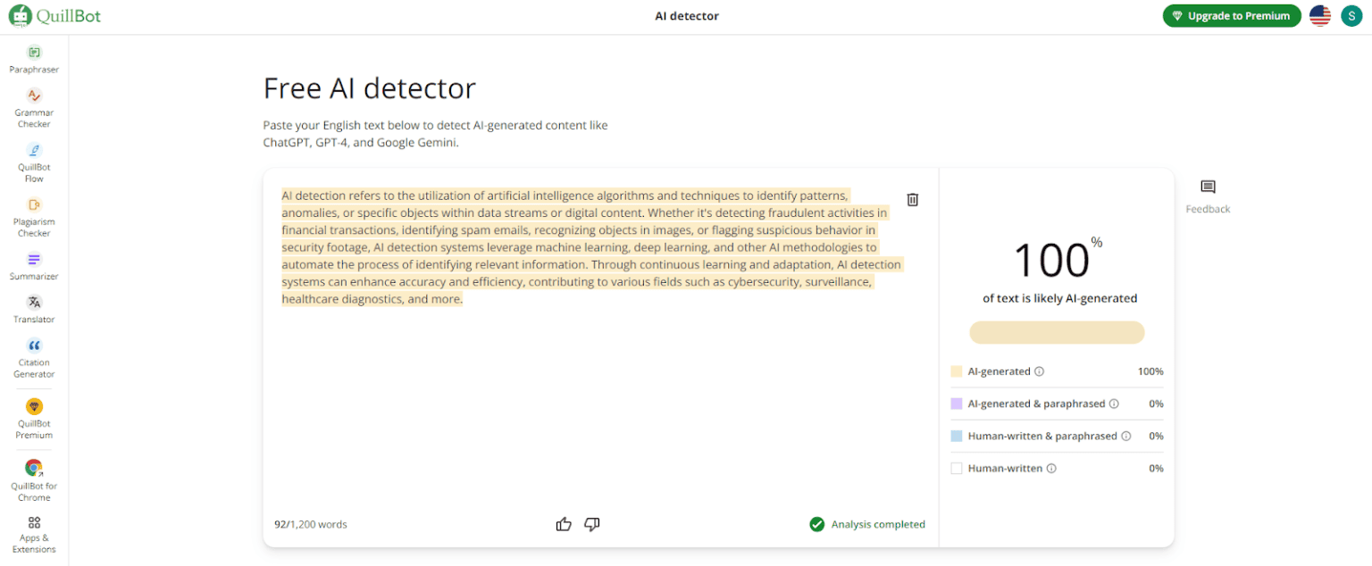 Did you know QuillBot has an AI detector in their platform? This tool’s features keep expanding rapidly. While we can’t say for sure how well it stops AI misuse, a quick check with text from ChatGPT suggests it has potential in AI detection.