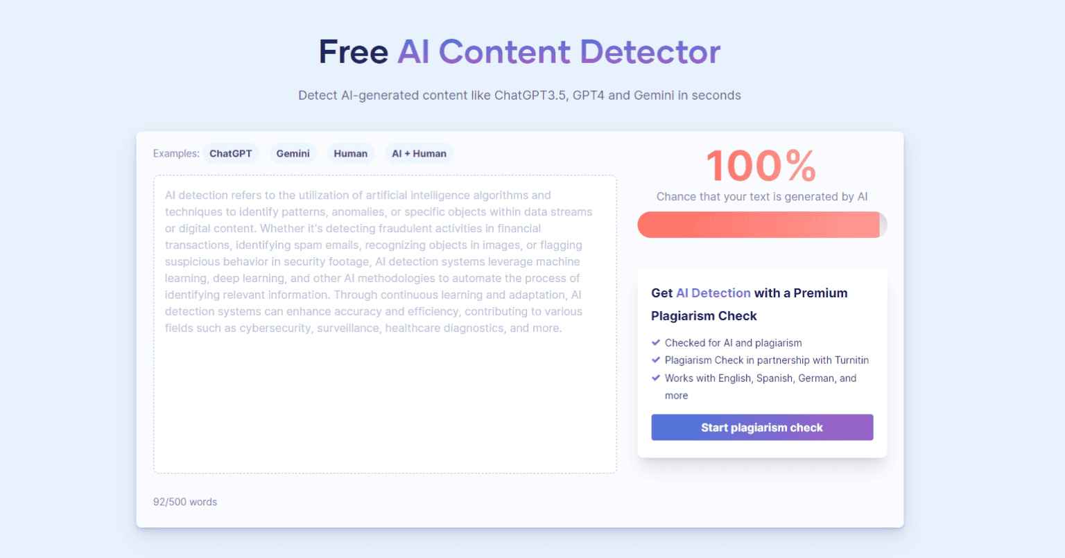 Originality AI was one of the first tools for AI detection and still ranks among the top options. It’s a reliable pick for those wanting to avoid dishonest content, scoring 70.29% on true and false positive tests in our 2024 review.