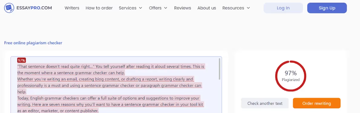 EssayPro was able to spot both examples of copy-paste plagiarism and did so quickly. They also offered a generous scan of up to 3,000 words for free. However, when it came to detecting patchwork plagiarism, their results weren’t as reliable.