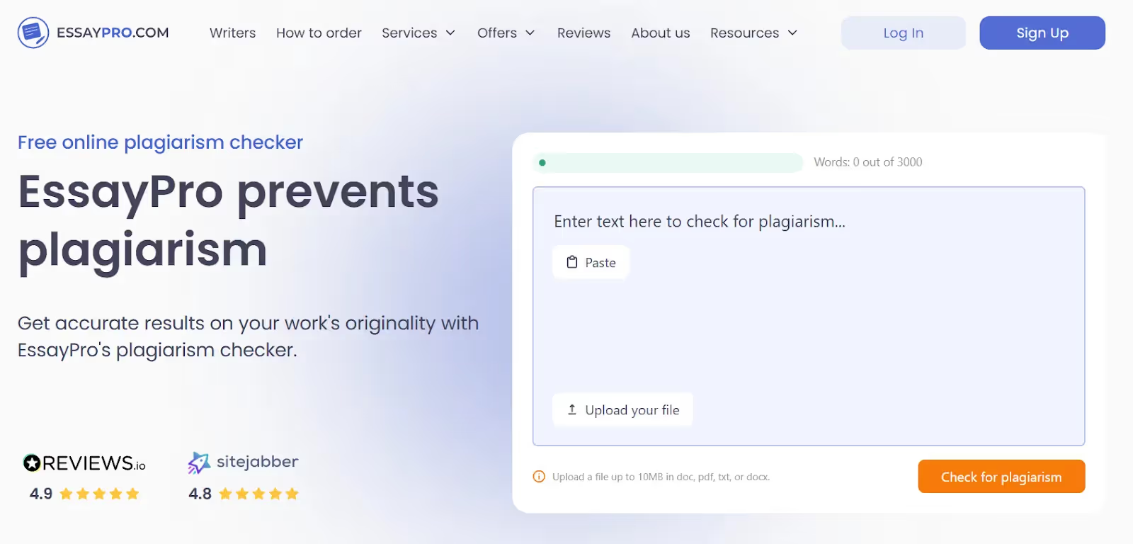 EssayPro offers a free plagiarism checker. You can paste up to 3,000 words. Files in .txt, .docx, or .pdf can also be uploaded. No registration is needed to use this tool.