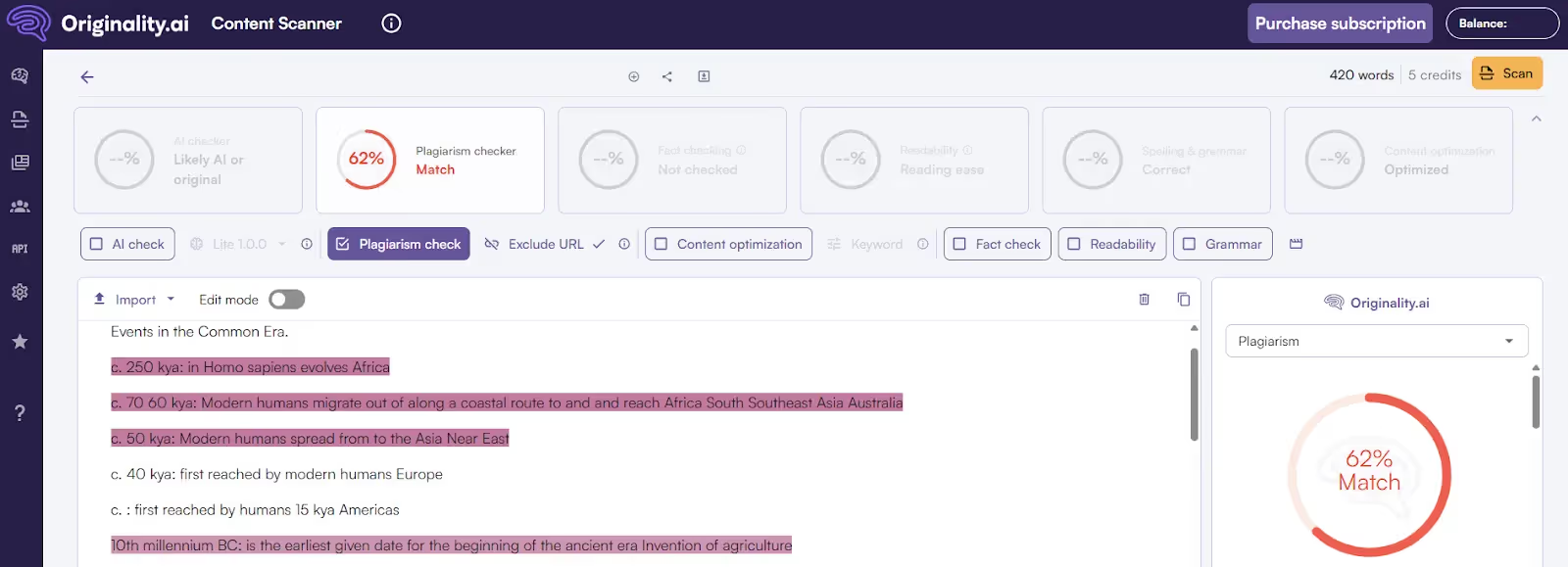 Originality.ai’s Plagiarism Checker works fast and carefully, creating a detailed report that points out possible plagiarized sections. This allows content experts to fix and adjust the text or add proper citations to avoid plagiarism.