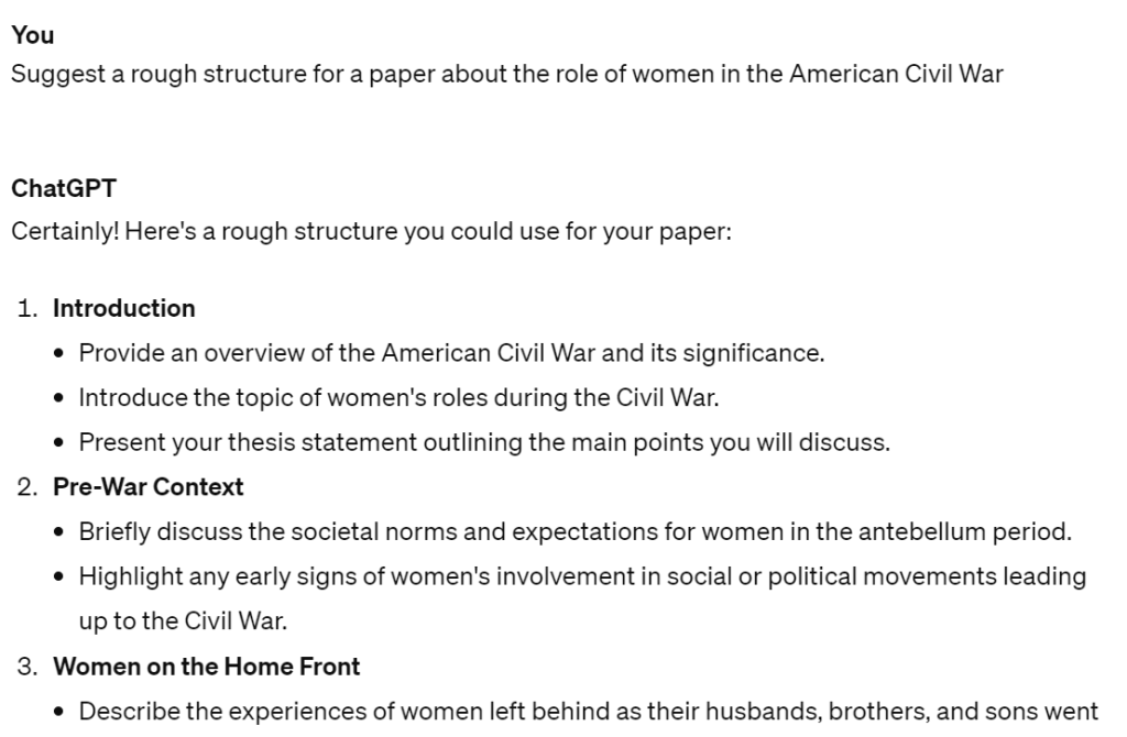We asked for a basic outline to continue a topic. Chat provided all the details needed to help with structuring the paper.