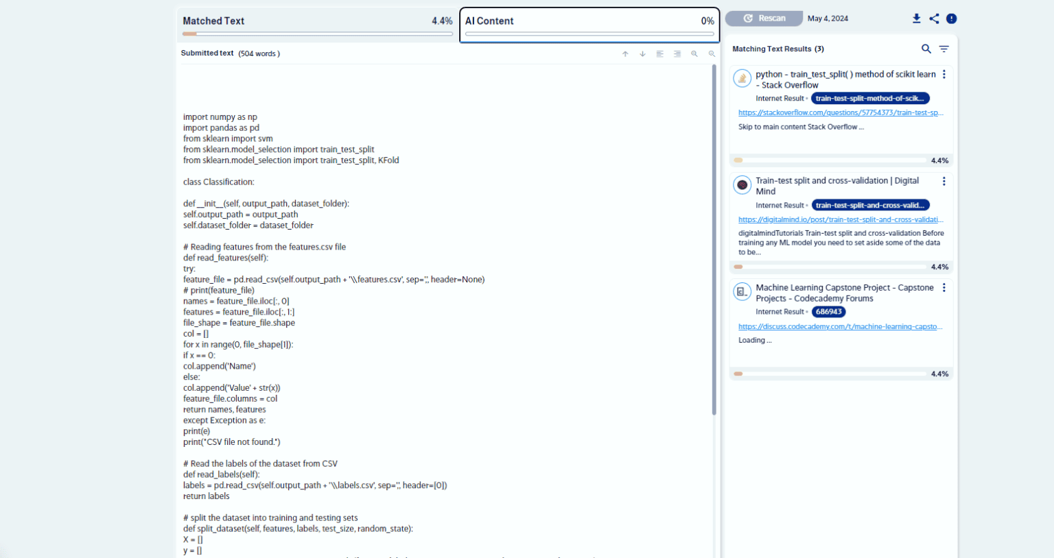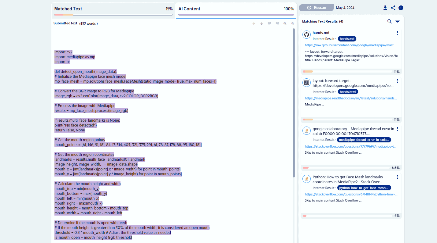 CodeLeaks is a tool in CopyLeaks that finds copied code, whether it’s from existing libraries or a language model. Each code entry produces a detailed report showing duplicated sections, their sources, and the percentage of plagiarism. We’ll explore this further soon.