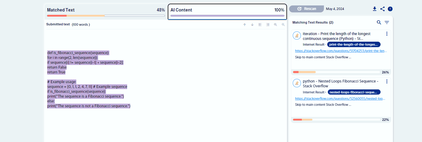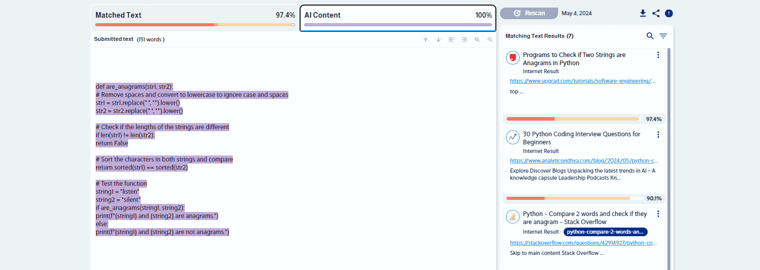Another thing that stands out is that CopyLeaks seems to spot AI in code better than in regular text. I think comments have a big role in this. Both the AI-made codes and the mistaken test had lots of comments and notes.