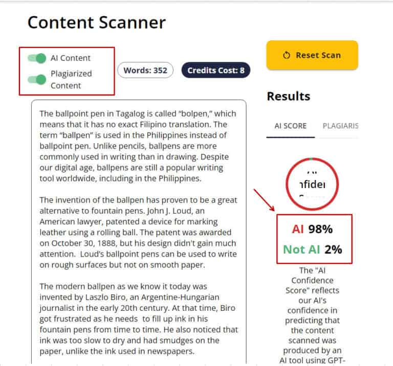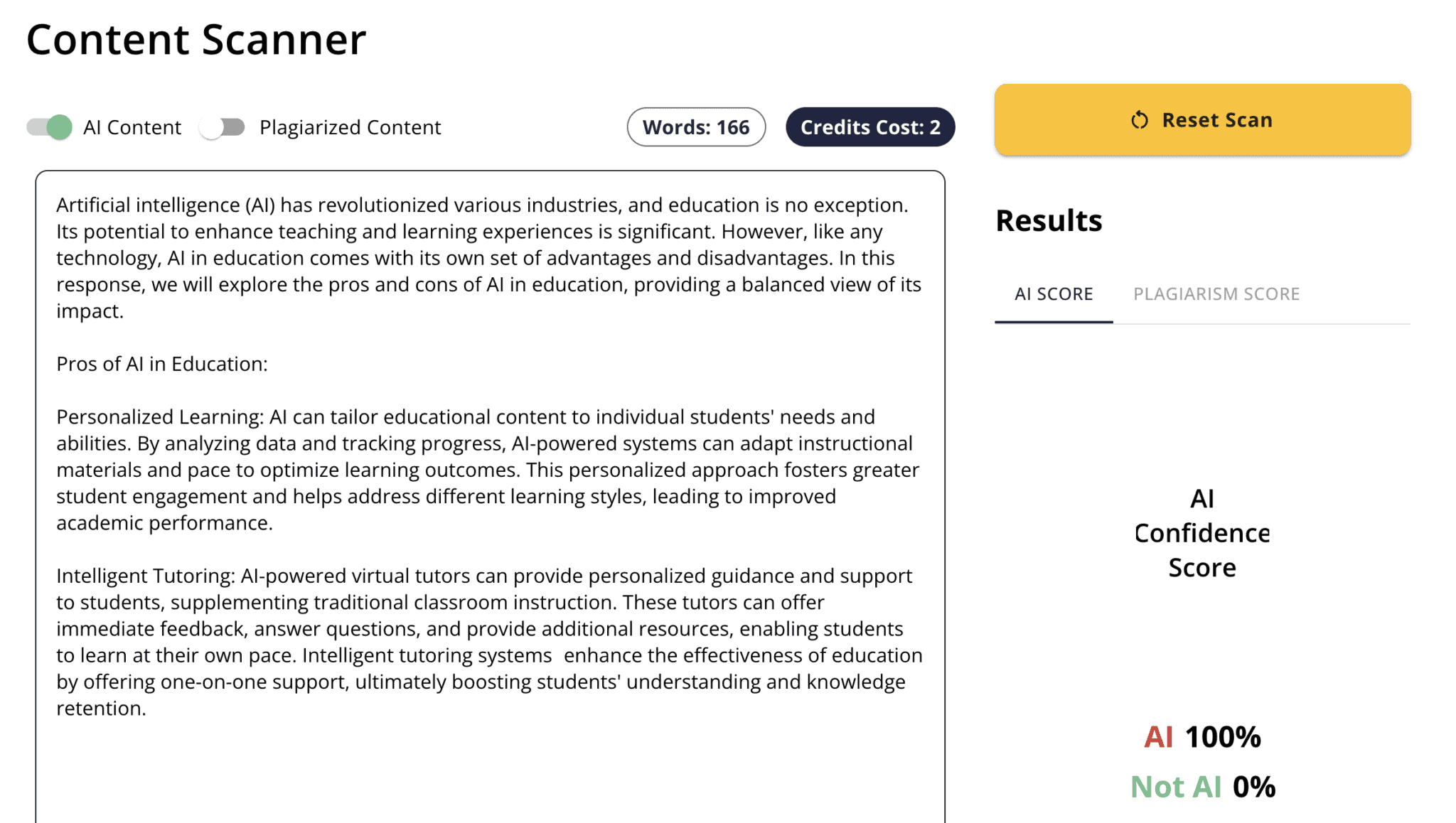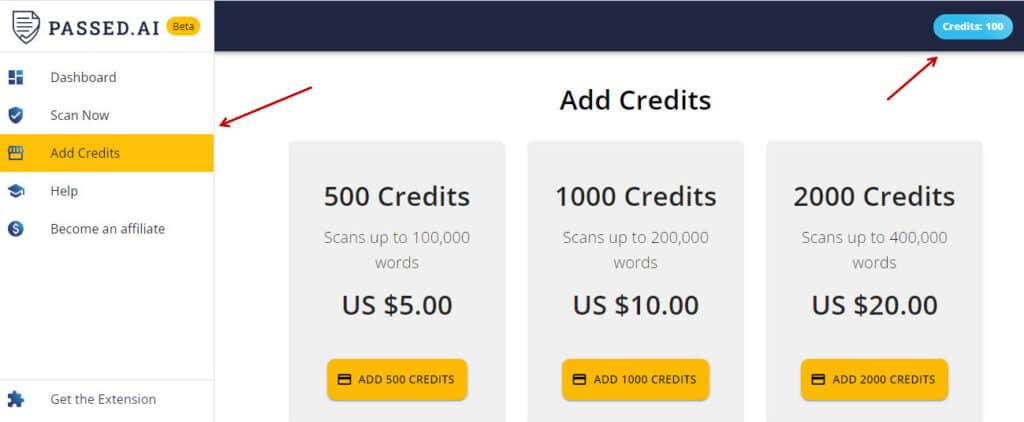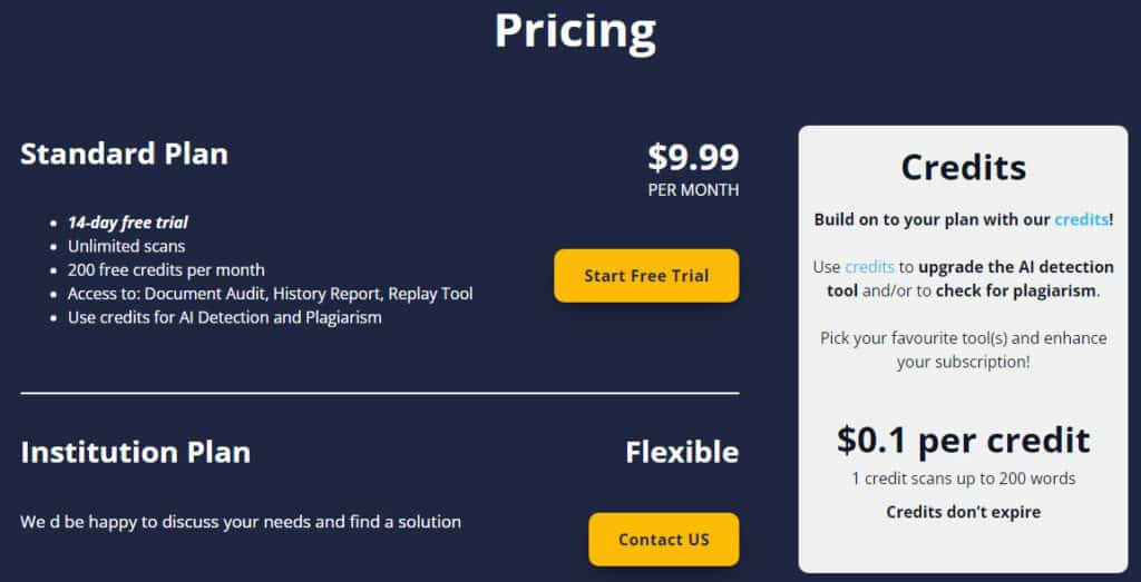 Each 100 words scanned uses up 1 credit. So, if you choose to do both AI detection and plagiarism checks together, it takes 2 credits per 100 words. It’s a cost-effective tool, but they keep credits and membership separate. You pay a fixed monthly fee for the membership and then purchase credits as needed.