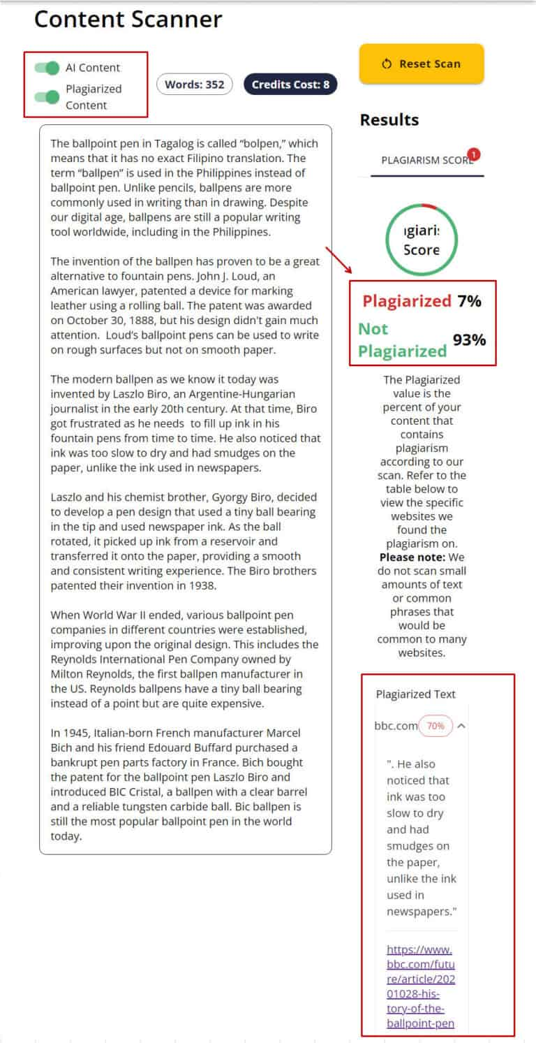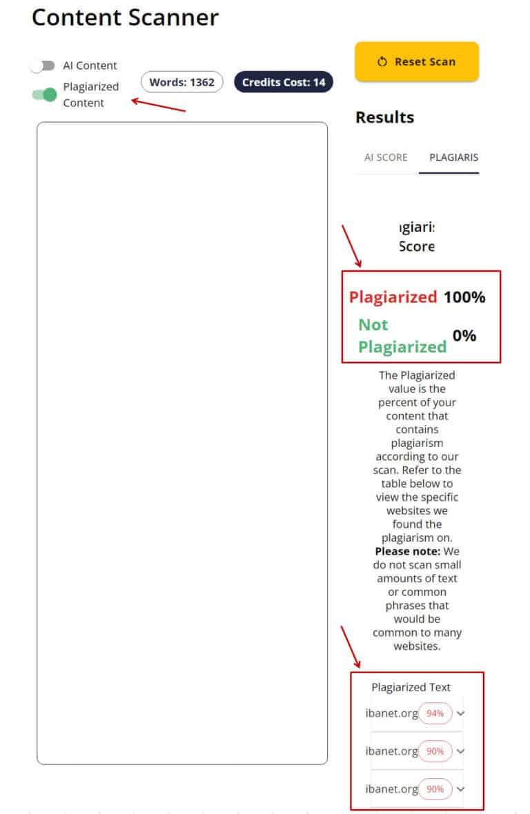Both tools give scores from 0 to 100% for results. A higher score shows a higher chance of AI-generated or plagiarized content. For plagiarized content, Passed AI shows the source website.