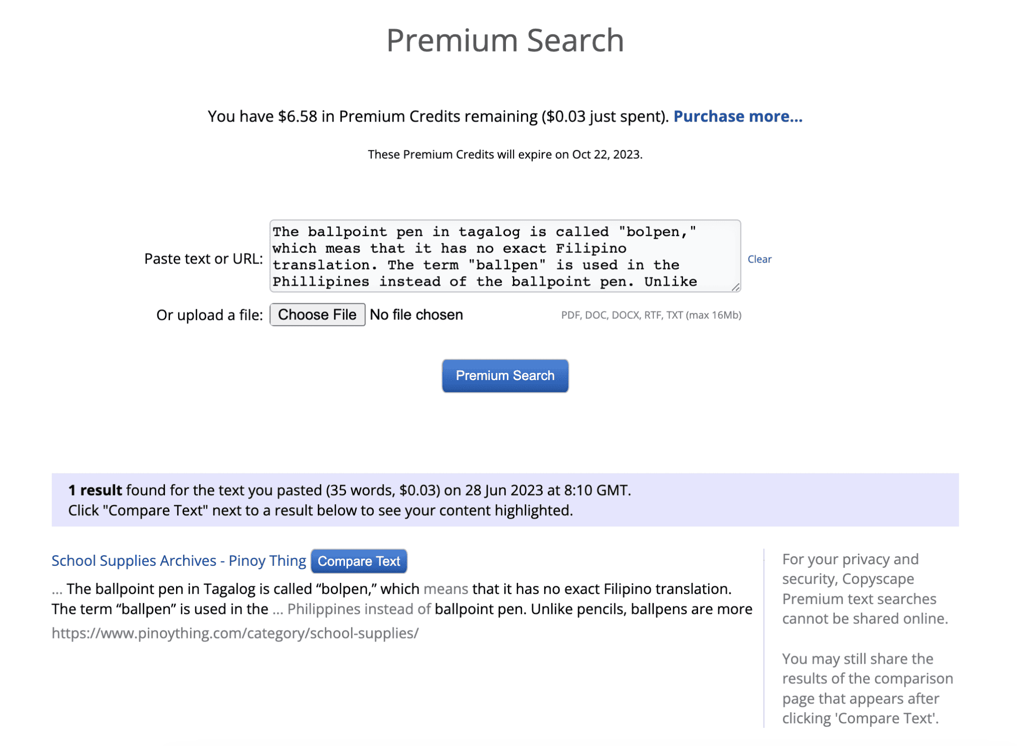 But, it couldn’t pinpoint the copied part or the original site. Copyscape looked at the whole text and didn’t bother with a line-by-line check.