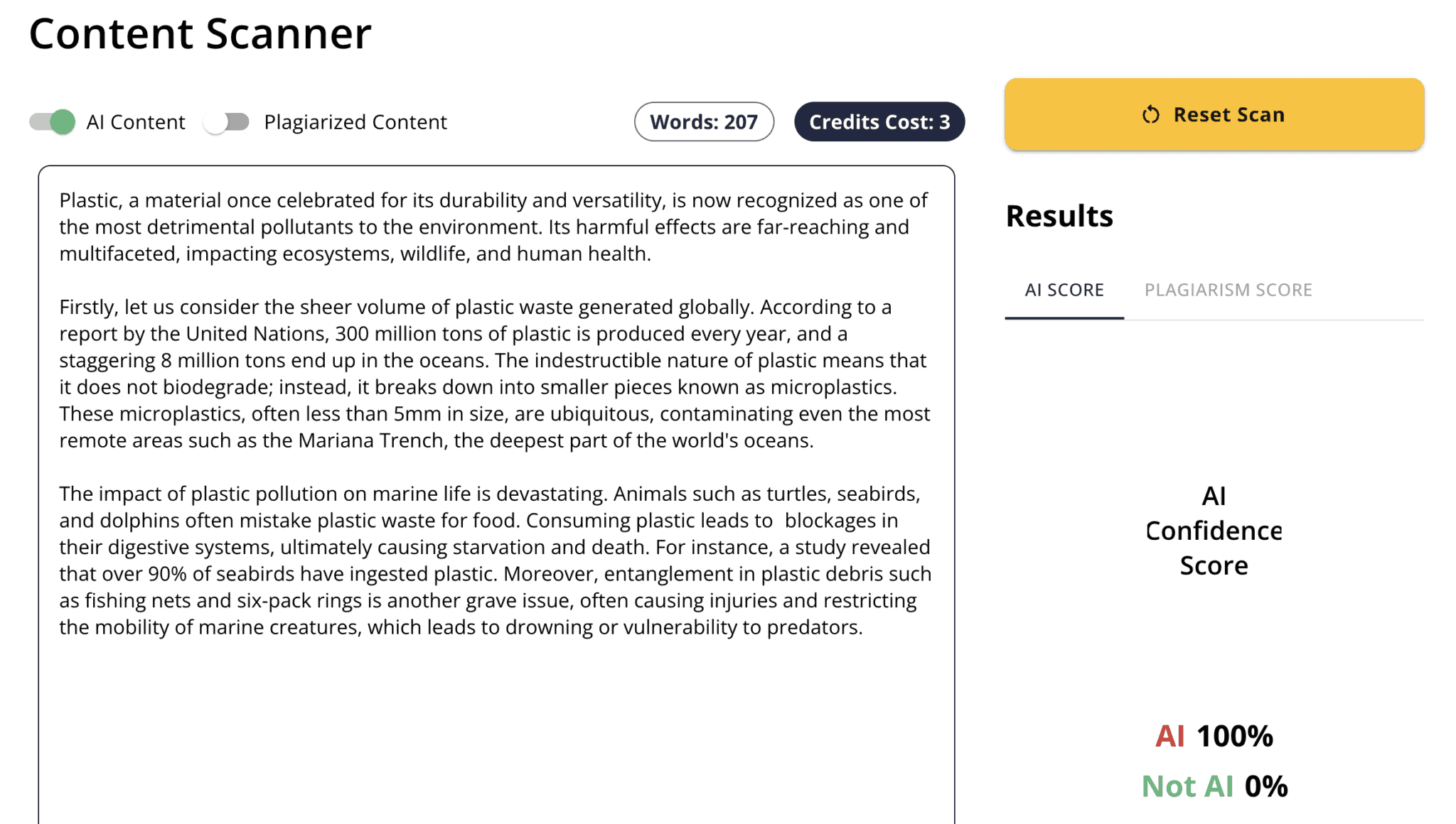 I wanted to check if Passed AI could tell if an article was original or copied from other sites, which is great for spotting plagiarism. I picked a 1,362-word article called “The negative environmental effects of plastic shopping bags” by Kelvin Chidi Ujeh from the IBA.