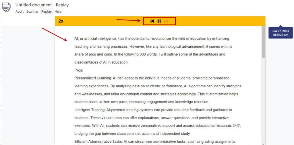 The Replay Tool acts like a video player, letting you watch each part of making a document. You can play, stop, and start again whenever you want. This feature is super helpful because it lets you look closely at how the author writes and spot any odd copy-pasting easily. Some might say it’s even better than AI detection itself.