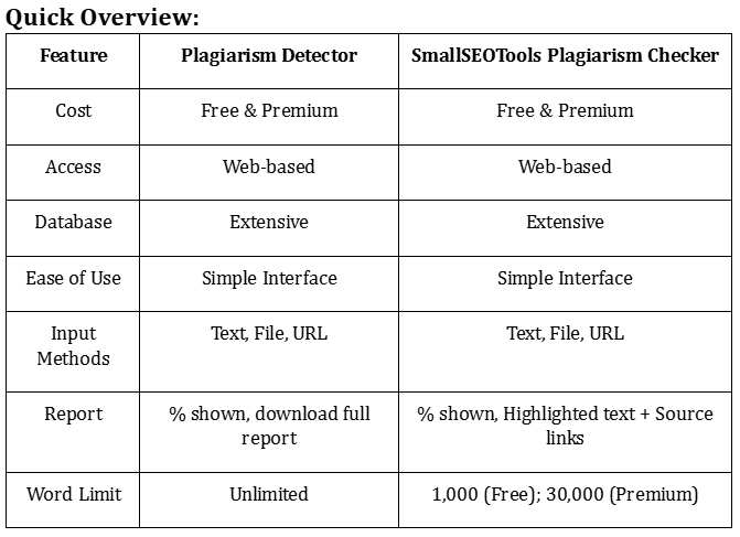 Both tools are very accurate. They have small differences. Plagiarismdetector.net is very precise at finding copied content. Smallseotools has an easy-to-use design and is also accurate.