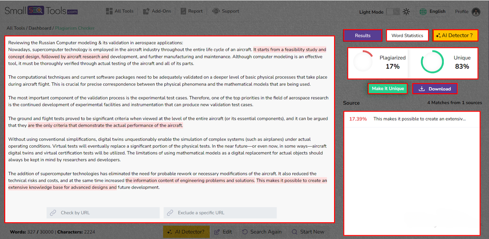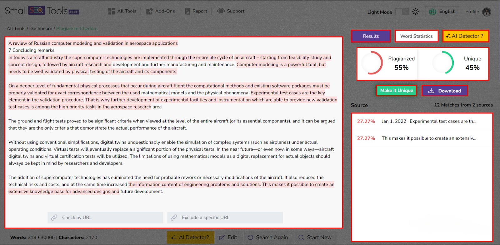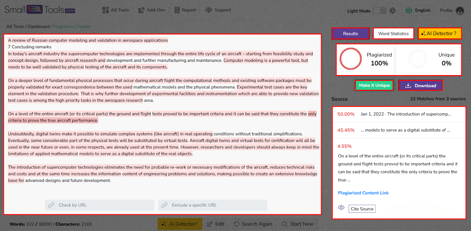 On the other hand, SmallSEOTools gives full reports highlighting copied parts with source links. You can quickly view the report or look over the entire document.