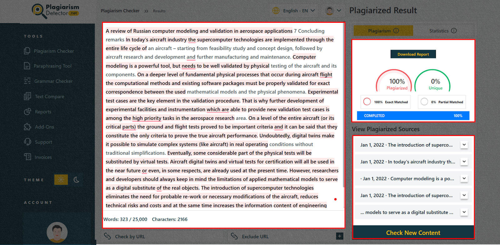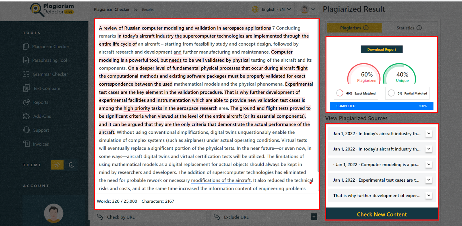 Plagiarism Detector creates thorough reports. They mark matched content and sources to help revise content. But, they display just the percentage. For extra details, users must download the report.