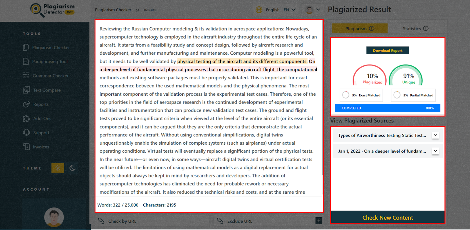 The plagiarism checker showed a 10% match with reworded content, though parts are still like the original. The report is trustworthy, but we’ll use another tool to check it too.