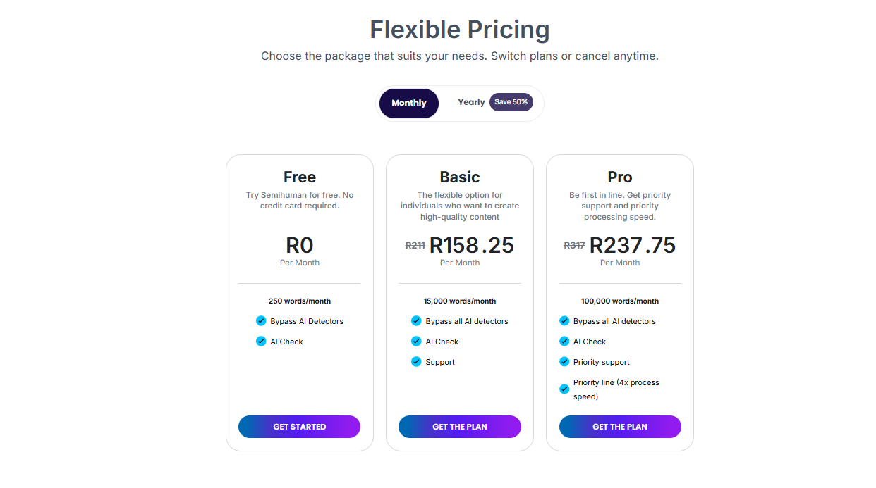 The Free Plan from SemiHuman AI includes only 250 words, which is barely enough to try it out. After that, you must choose a paid plan: