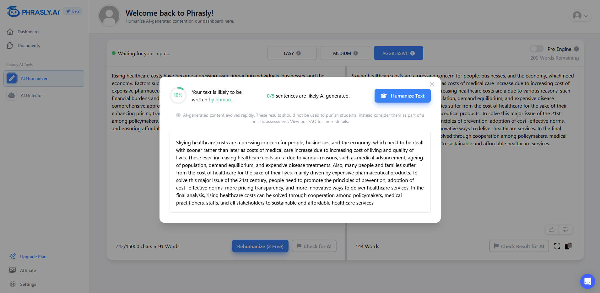 The result wasn’t as good as the original; it had strange wording and sentence flow. Then, we asked Phrasly to check if AI wrote the text. It said it was “likely human” with a 10% chance of being AI-generated.