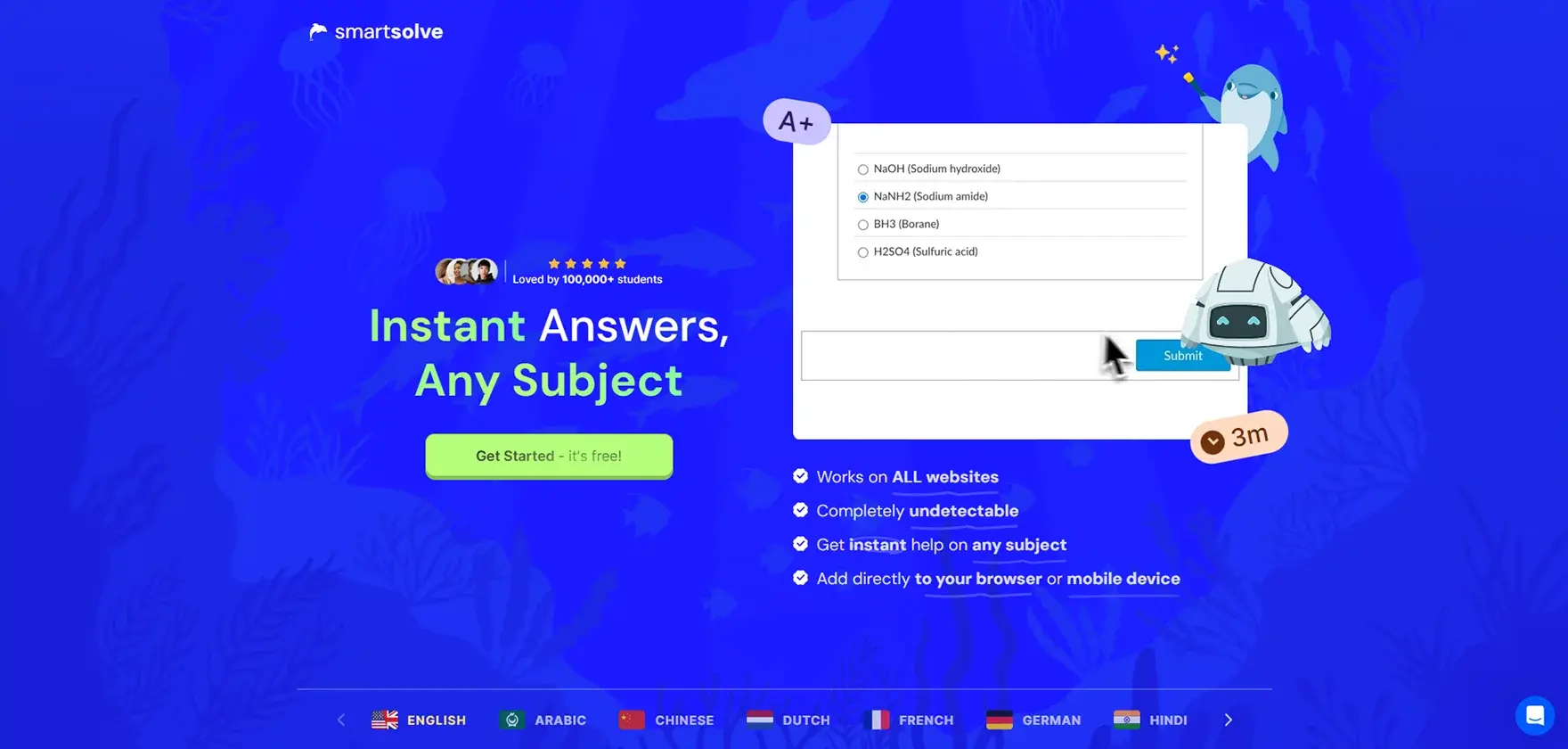 SmartSolve is a handy tool that can underline text from online assignments and quickly offer solutions with an impressive 98.97% accuracy. It also provides multiple-choice questions and quiz formats to make studying more interactive while tracking and evaluating student progress based on test results.