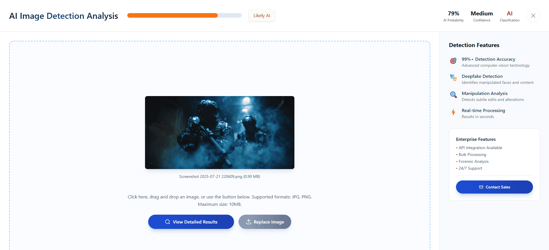 This tool is essential. It examines images created by tools like DALL·E, Midjourney, Stable Diffusion, and similar diffusion models. It identifies them by spotting patterns that people might not see, such as texture mismatches, too-smooth gradients, and metadata quirks.