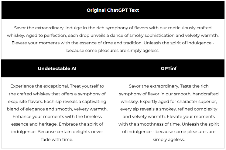 I’m quite happy with both marketing copies; they seem pretty solid. That said, there’s room for a bit of tweaking. For instance, in Undetectable AI’s copy, the last sentence could join with the one before it using a comma. Also, in GPTinf’s text, the phrase “character superior” feels a bit unclear to me.