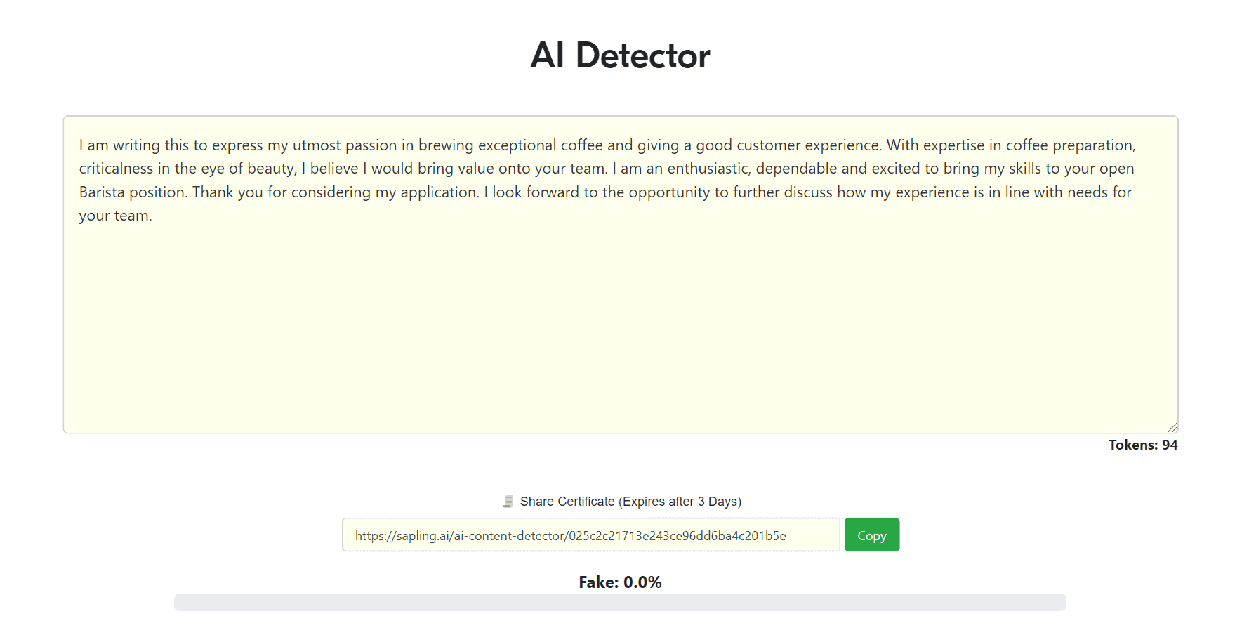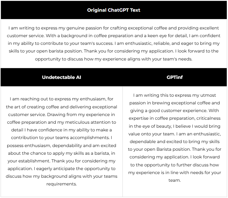 I’d call this a draw. Undetectable AI is easier to read than GPTinf, similar to essays, but it has more punctuation mistakes. On the other hand, GPTinf doesn’t flow as smoothly due to grammar issues, like in this sentence: “I am an enthusiastic, dependable and excited to bring my skills”