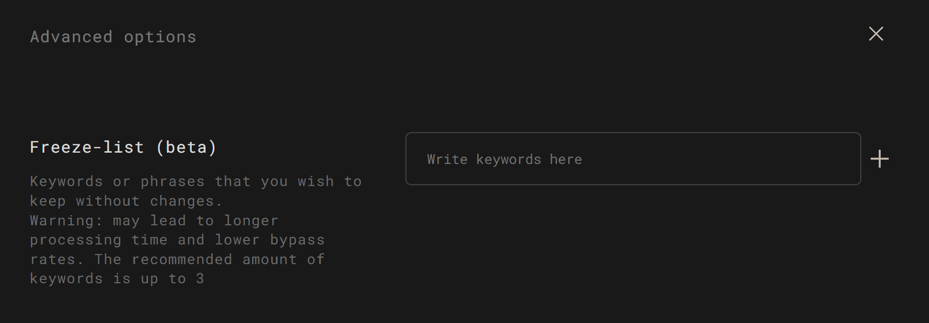 Let’s talk about GPTinf’s features. Actually, it really just has one main feature. Besides its AI bypass tool, GPTinf includes a freeze list. This lets you pick parts of your input that should stay the same.