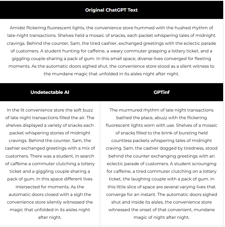 I noticed that Undetectable AI and GPTinf have different goals. The first tries hard to avoid AI detection, while the second aims to keep the story going.
