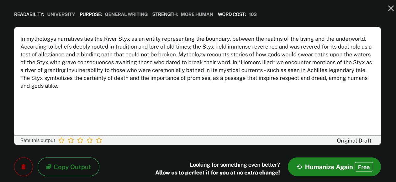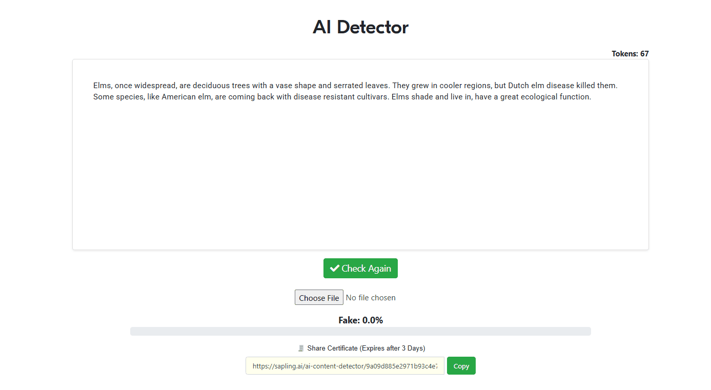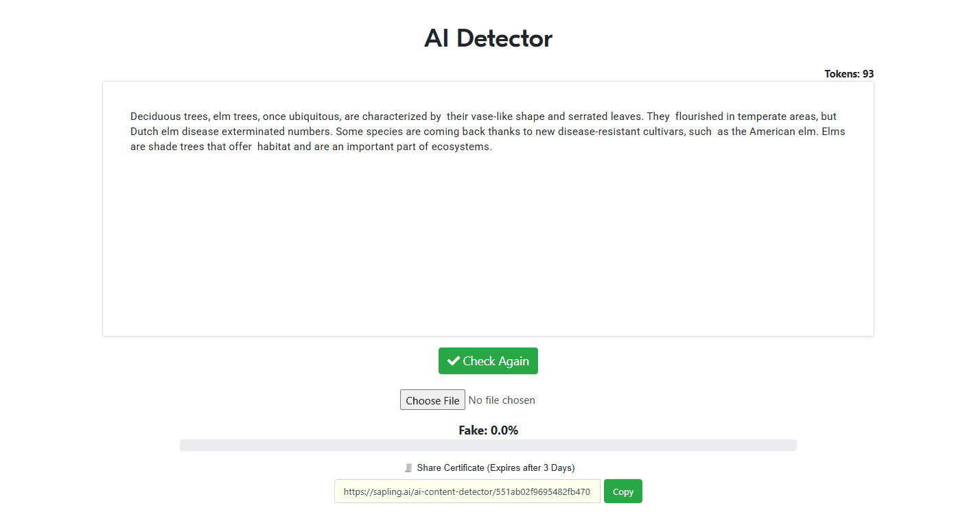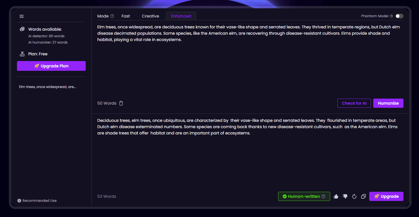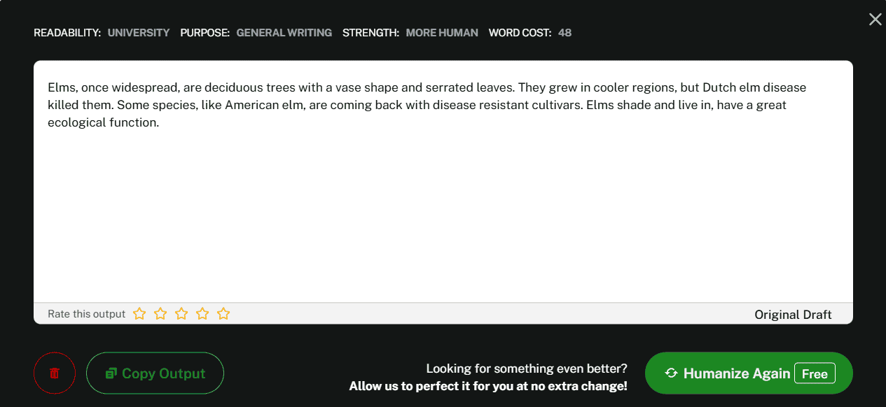 Undetectable AI isn’t perfect either — it omits articles (“American elm” instead of the American elm) and has awkward lines like “Elms shade and live in,” which feels like a jumbled grammar exercise. Still, it stays truer to the original and is easier to read. The main idea is clear, even if it’s not polished.