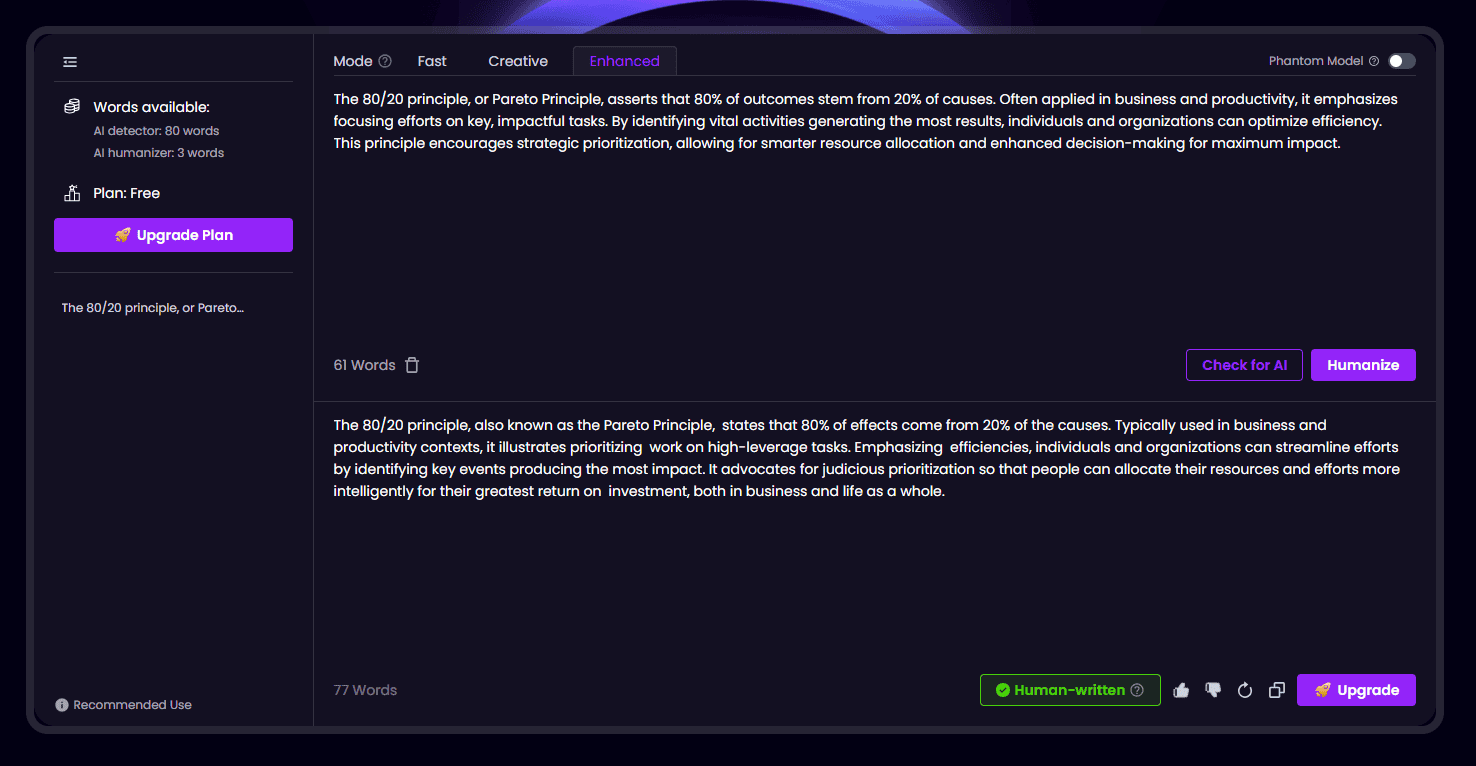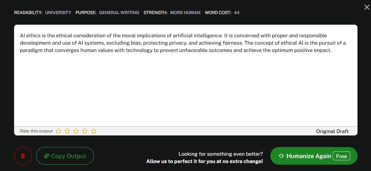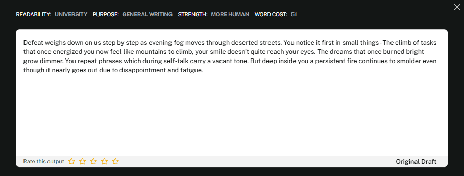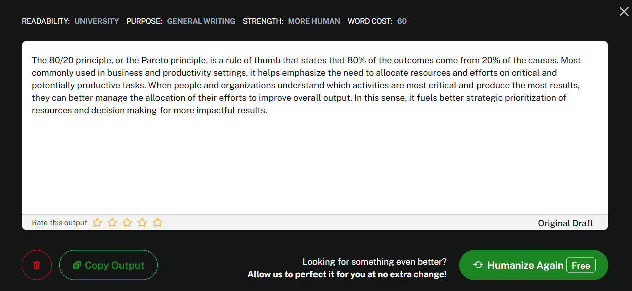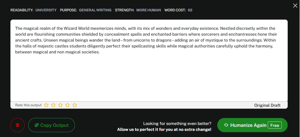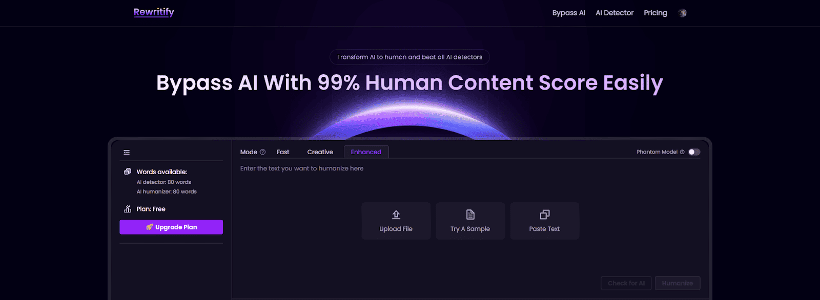 Rewritify is quite good, but I don’t see it as a good buy. It doesn’t offer anything that Undetectable AI can’t, and it’s less budget-friendly. Plus, their free trial is limited (only 80 words per account, while Undetectable AI offers 200 words and daily spins for extra words), making it harder to access.