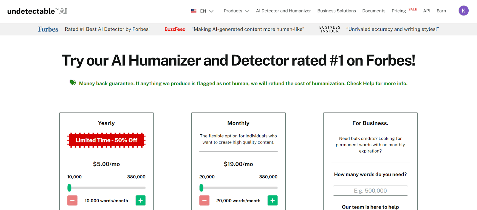 Undetectable AI offers simple pricing: $5 a month with a yearly plan, including a 50% discount, or $19 for the monthly option. Each has a word cap — 10,000 for the yearly and 20,000 for the monthly — but you can increase it to 380,000 words if necessary.