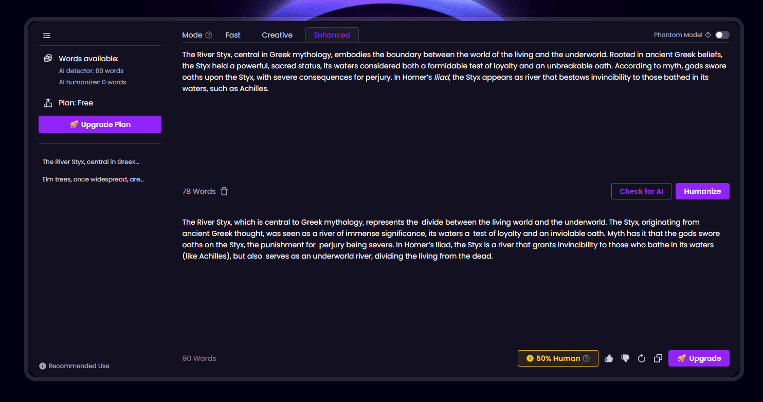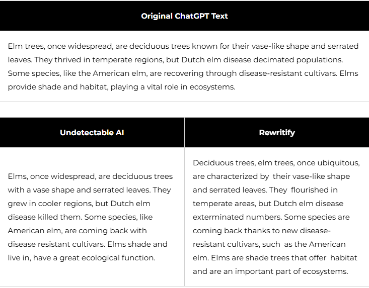 The first noticeable aspect is the tone and clarity. Undetectable AI is straightforward and simple, almost bare, while Rewritify tends to be overly elaborate — sometimes awkwardly so. For example, the phrase “elm trees, once ubiquitous, are characterized by their vase-like shape” seems like it’s from an overly complex thesaurus entry.