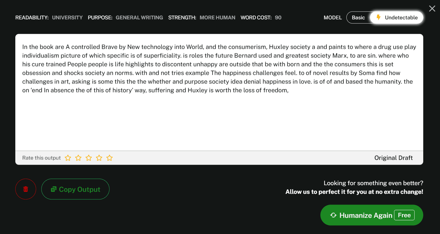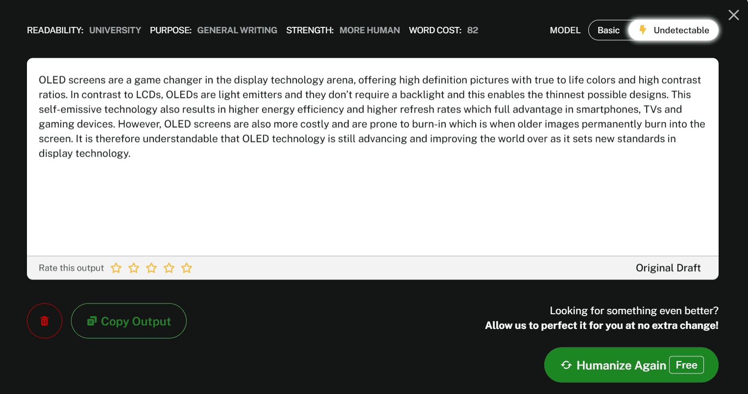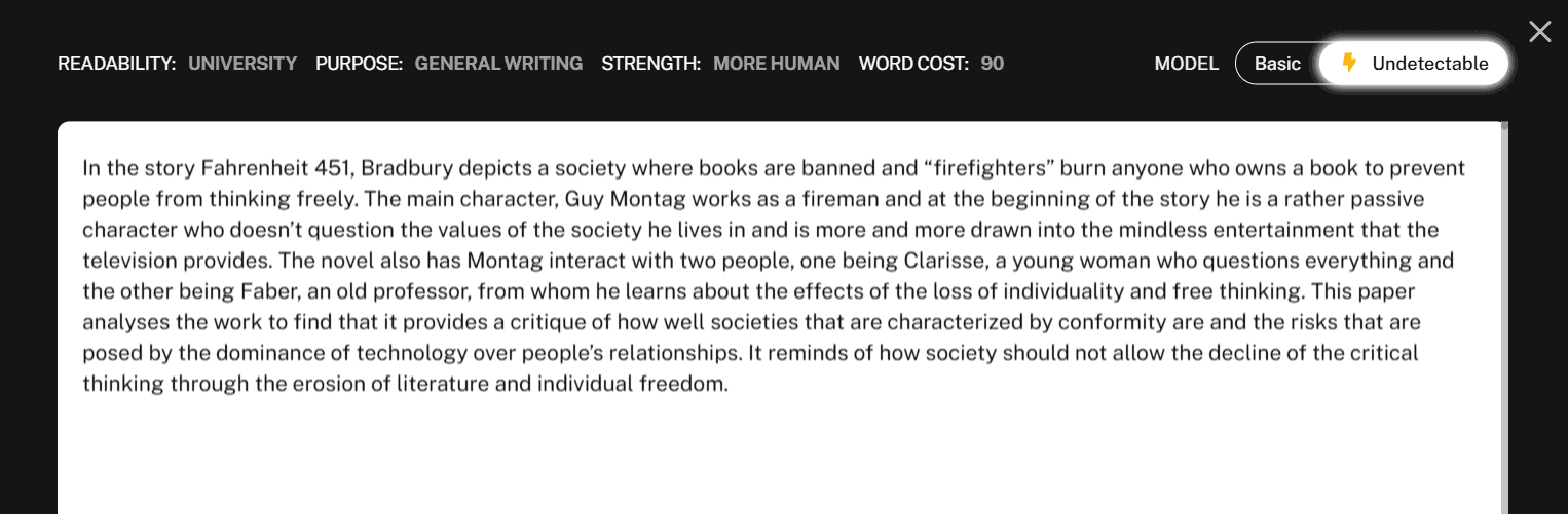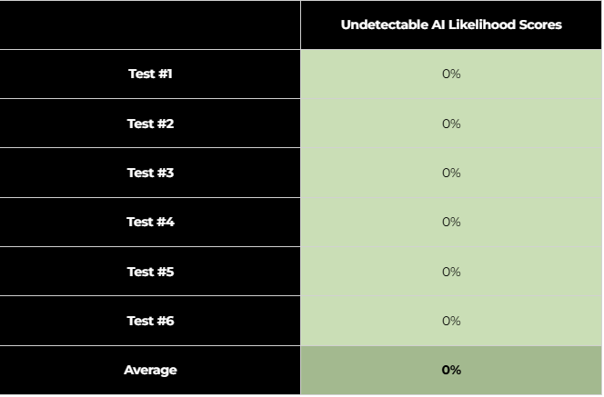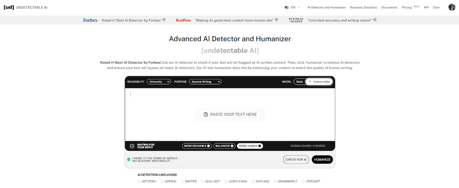 Undetectable AI is one of the first AI bypass tools available, and it’s the one I trust most. They make text more human-like by removing common AI terms, altering sentence structures, and adding a few intentional mistakes. You can find more information in our full review of the platform.