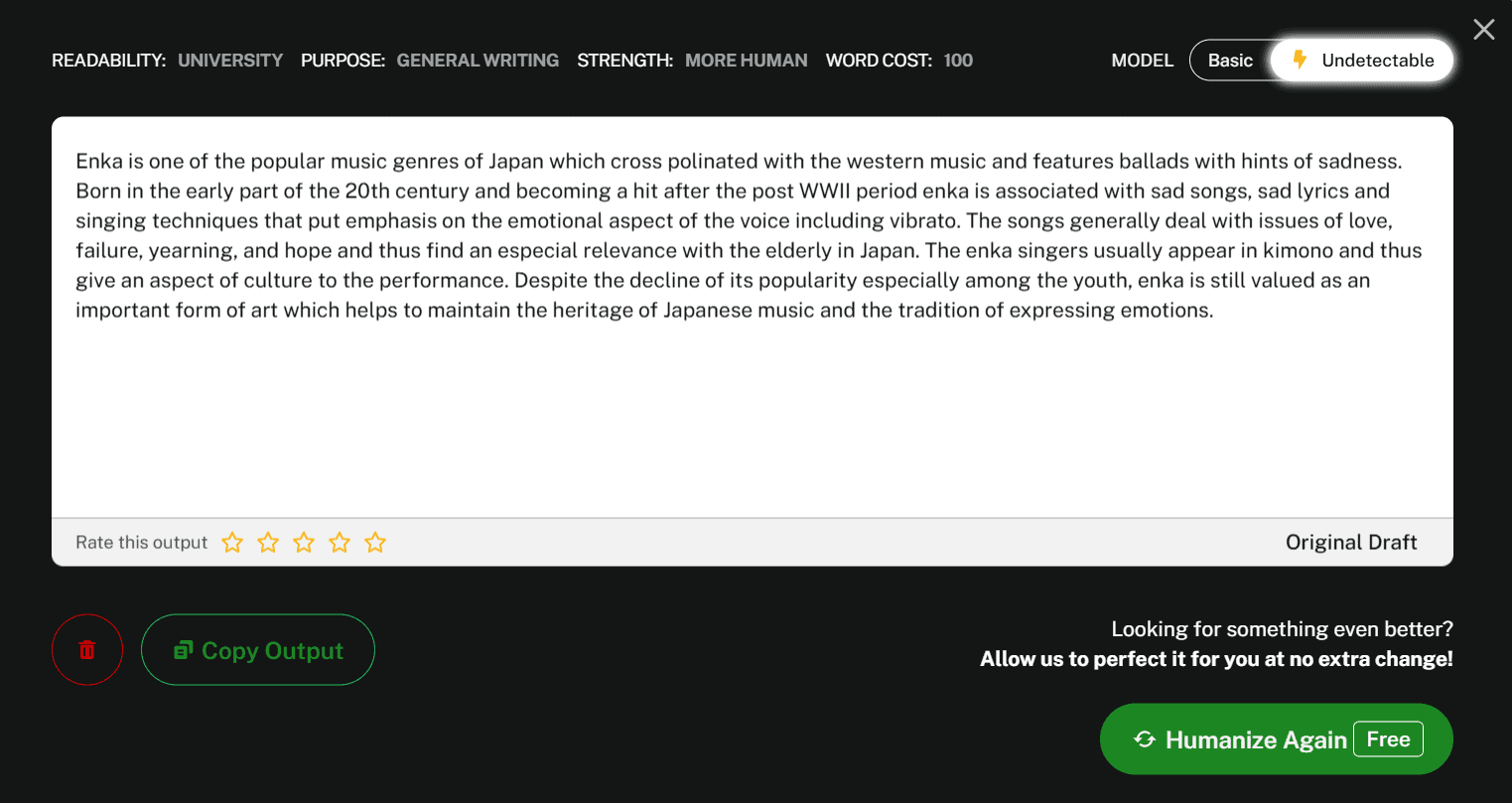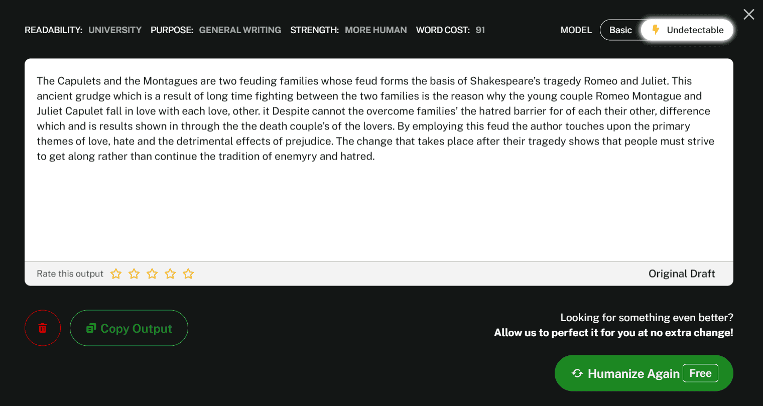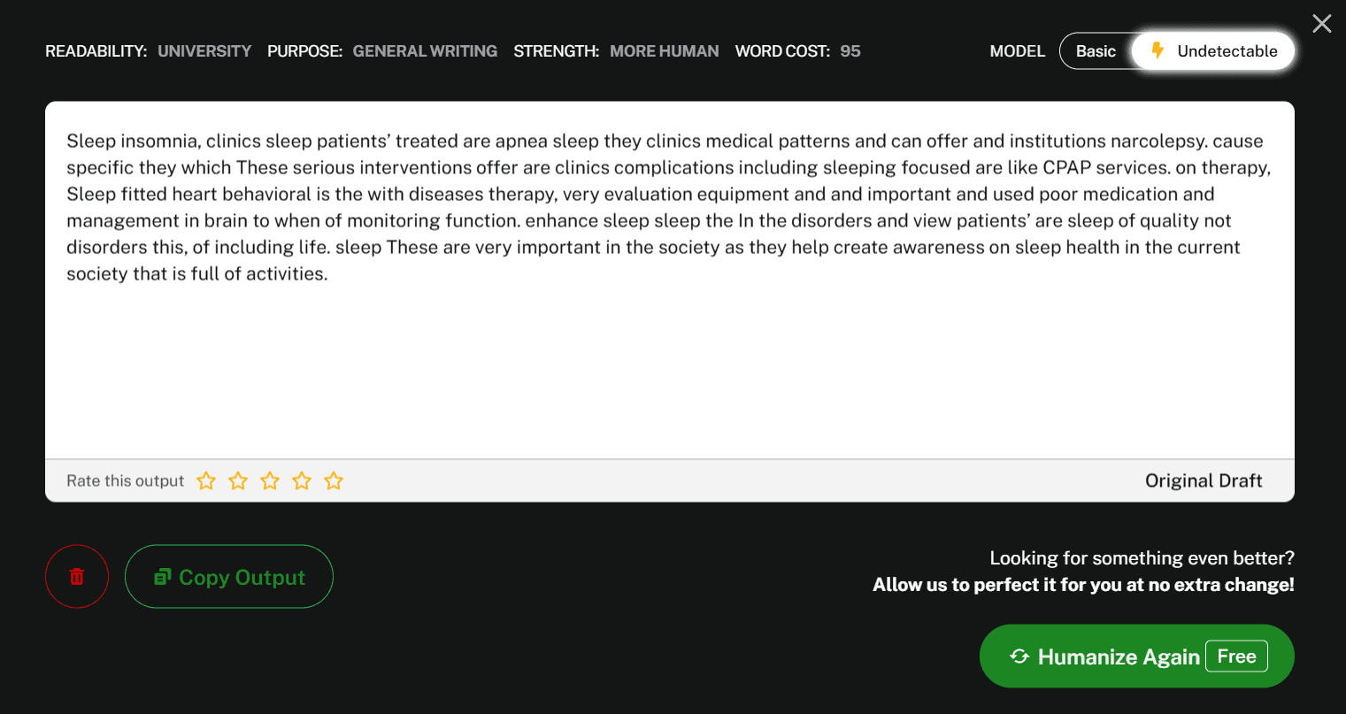 Undetectable AI is one of the first AI bypass tools available, and it’s the one I trust most. They make text more human-like by removing common AI terms, altering sentence structures, and adding a few intentional mistakes. You can find more information in our full review of the platform.